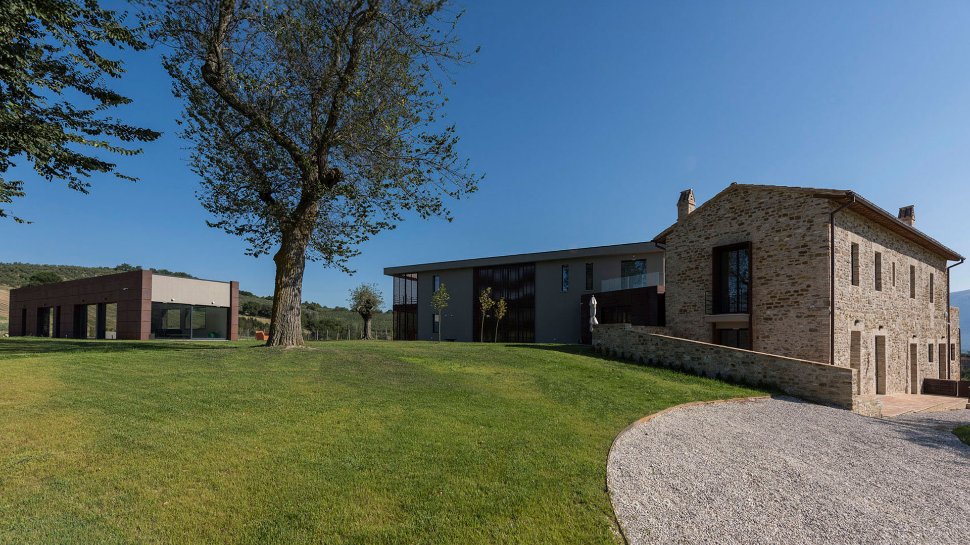 The landscape design reinforces the character of this Umbrian property, ensuring that the new buildings feel deeply rooted in their environment.