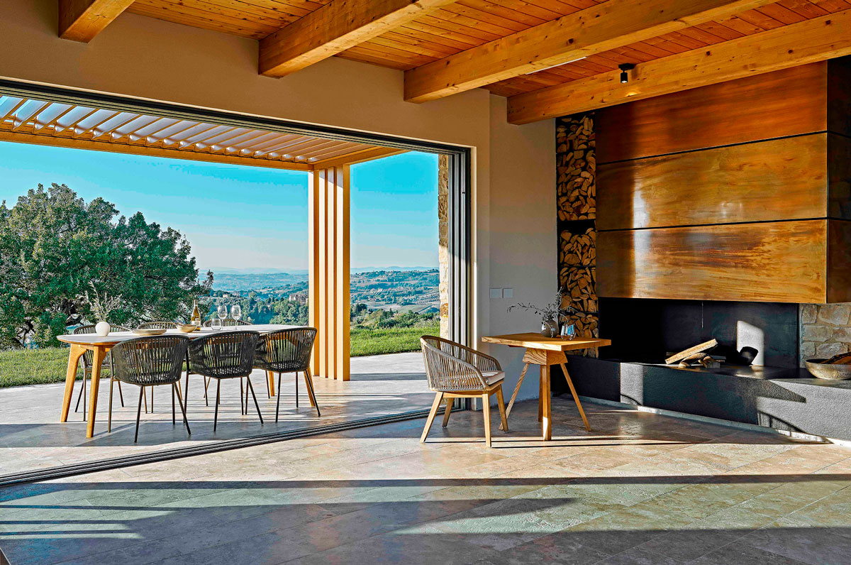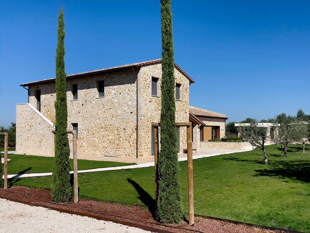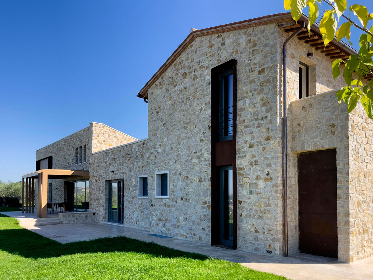 The design intent was to create an intervention that integrates harmoniously into the Umbrian landscape, using traditional materials enriched with contemporary elements such as Corten steel window frames and wooden screens. These features define the project in the present day, ensuring a clear distinction between what is historically authentic and what, while referencing traditional architecture, belongs to our time.